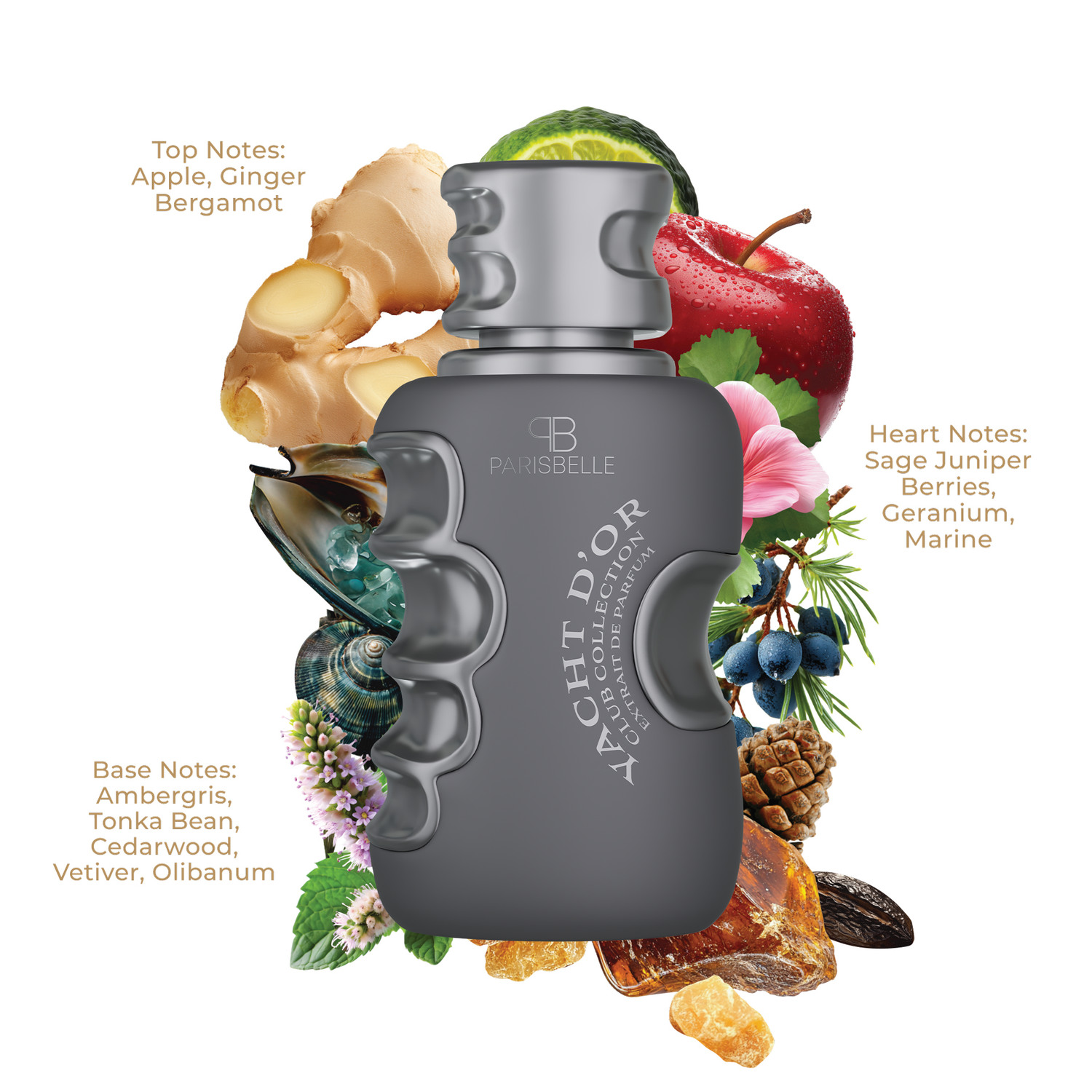 It opens with crisp apple, zesty ginger, and sparkling bergamot—a prelude of fresh sophistication and vibrant energy. At its heart, aromatic sage, juniper berries, geranium, and marine nuances evoke the refined serenity of sunlit seas. The finale rests on warm ambergris, tonka bean, cedarwood, vetiver, and olibanum, leaving a luminous, lingering trail of elegance that captures the essence of timeless luxury.