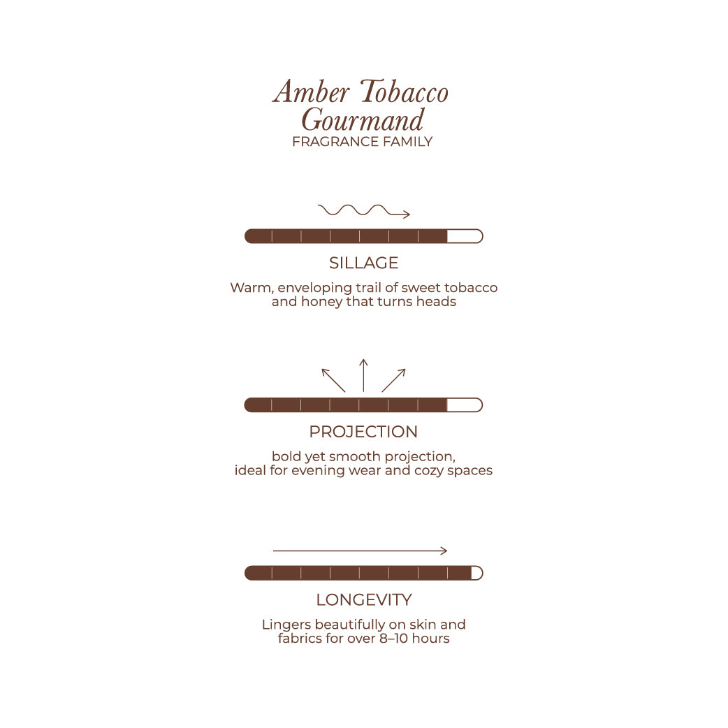 Honey Tabac envelops you in honeyed warmth and spiced allure. Tobacco and sesame melt into creamy tonka, deep agarwood, and sandalwood a smoky, irresistible embrace of forbidden sweetness.